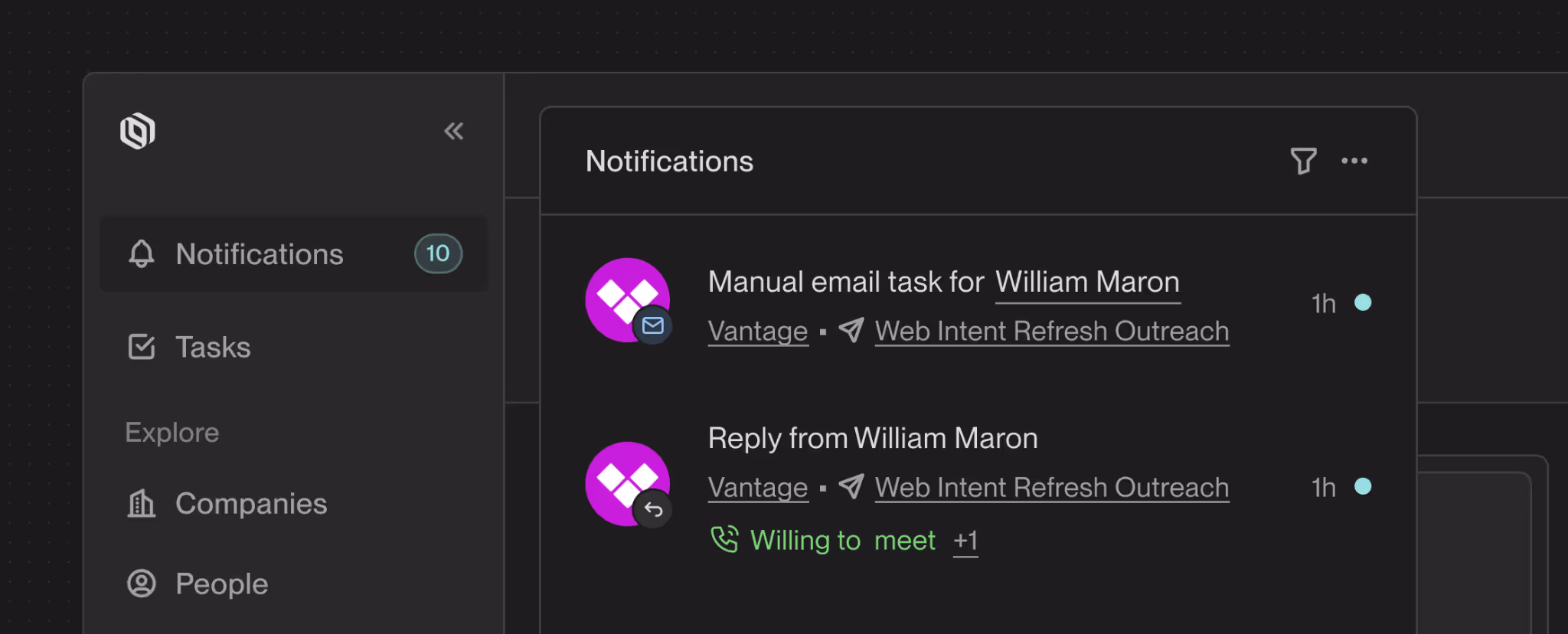 - Real-time Notifications: Positive replies, urgent tasks, and key updates surface instantly across Slack, email, and in app so sellers never miss an opportunity to act.