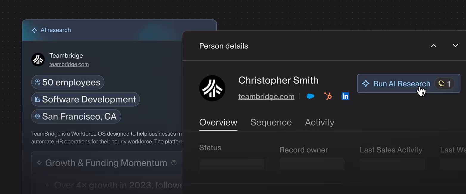 - AI Research - Leverage an AI assistant that gathers relevant data, news mentions, CRM history and more on your prospects that then synthesizes it all into a tidy report for you and your reps. Stay informed on all your top quality leads in real time.