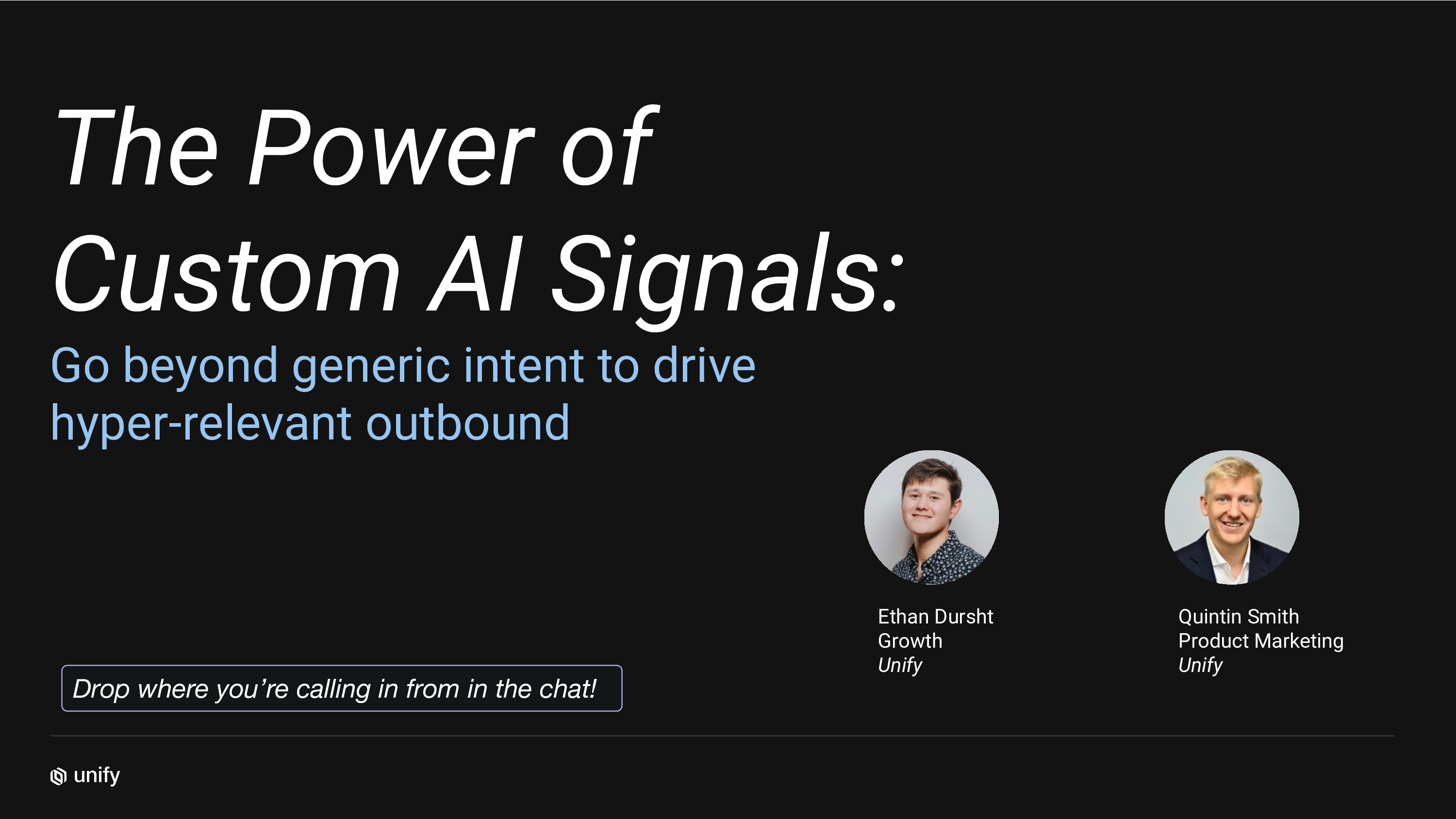 In this webinar, Quintin Smith & Ethan Dursht from Unify's marketing & growth teams, break down how leading GTM teams are shifting from broad intent data to business-specific custom AI signals that surface real buying triggers and turn them into scalable outbound plays.