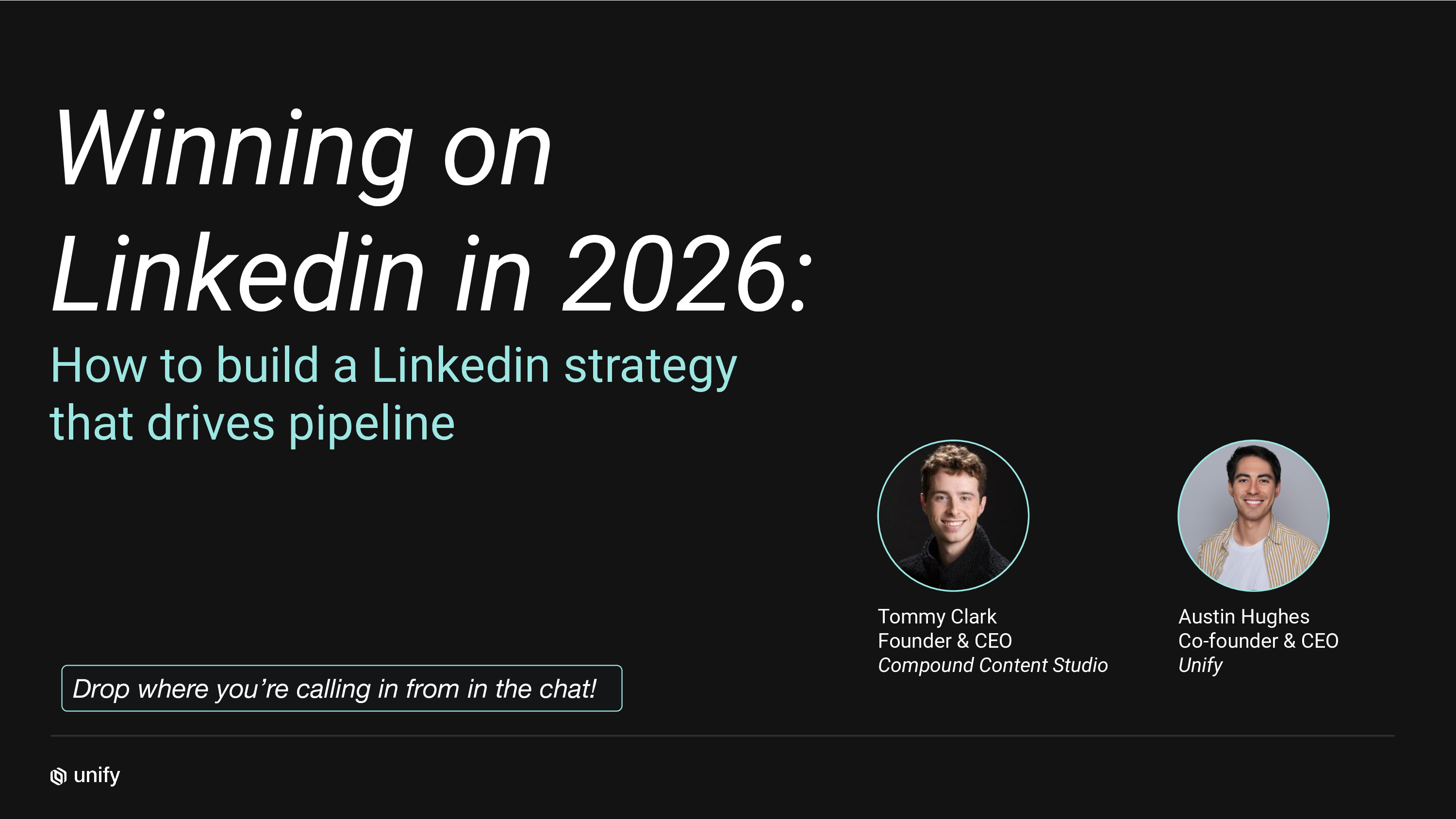 In this webinar, Austin Hughes, Co-founder and CEO at Unify, and Tommy Clark, Founder and CEO at Compound Content Studio, broke down how founders and GTM teams can build a LinkedIn strategy that drives real pipeline in 2026, not just impressions.