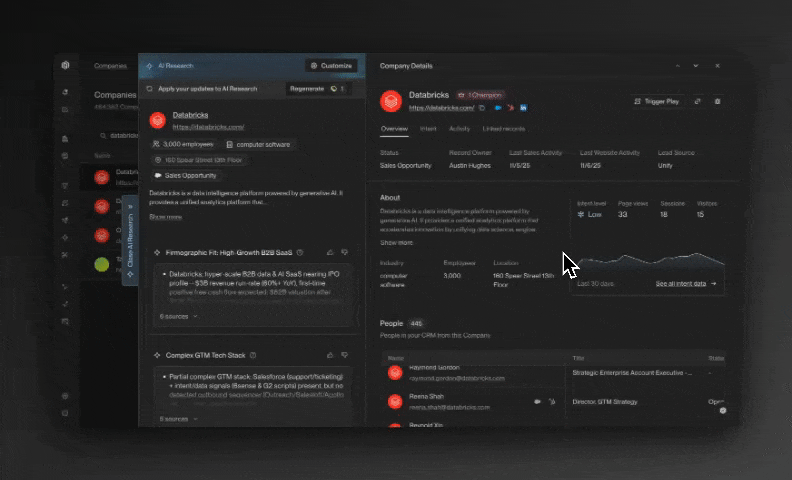 Buyer Data connects directly to Unify Plays, Sequences, and Tasks. When new intent surfaces, qualification, prospecting, enrichment, and sequencing trigger automatically, turning signals into pipeline without manual effort.