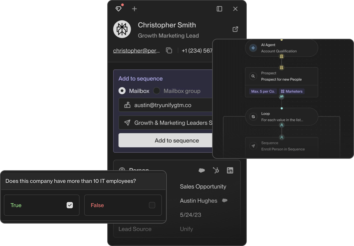 AI-powered prospecting identifies your ideal personas across target accounts. The Unify Browser Extension lets sellers source and enrich directly from LinkedIn, reducing time spent on manual research and keeping prospecting aligned with intent.